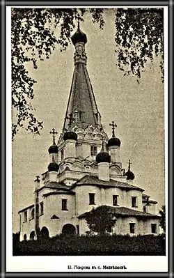 L'église de l'Intercession-de-la-Vierge de Medvedkovo a été construite en 1635[1] par le prince Dmitri Pojarski en l'honneur de la libération de la Russie, après la guerre russo-polonaise. Sa structure architecturale est une variante de dimension réduite de celle de la Cathédrale Saint-Basile-le-Bienheureux de Moscou[1]. La ressemblance est peut-être visible à l'extérieur, remarque Véra Traimond, tandis que le plan s'avère nettement différent[2].