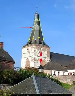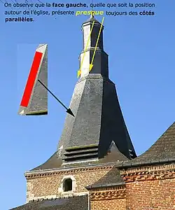 Ce clocher, dont la torsion a été conçue à l'origine, est original puisqu'il joue sur un effet d'optique. La base de sa flèche regardée sous à peu près n'importe quel angle, voit sa face gauche apparaissant comme un parallélogramme. Cependant selon l'angle les 2 arêtes gauches du clocher tors ne sont toutefois pas toujours parallèles.