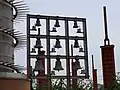 Une cheminée industrielle fait office de clocher. L'église a une capacité de mille places environ.