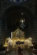 L'intérieur est richement décorée selon les canons byzantins, orné entièrement par de peintures à l'huile imitant la mosaïque. Dans le presbytère se trouvent trois autels. La grande lampe d'argent qui pend à l'entrée est un cadeau du tsar Paul Ier.