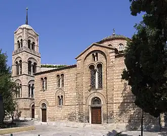 La plus grande église byzantine d'Athènes ayant survécu[1], elle est « clairement la plus ancienne et la plus fidèle copie » du grand katholikon du monastère d'Ósios Loukás, tant du point de vue de la morphologie, des dimensions - l'église athénienne présente des mesures presque exactement aux trois quarts de celles d'Ósios Loukás - que de la décoration[13]. Son plan est celui d'une église à croix inscrite, typique de la période moyenne byzantine, avec un dôme reposant sur une base de forme octogonale[13],[14]. La maçonnerie est de grande qualité, avec des pierres de taille séparées par des doubles rangées de briques[15]. L'extérieur de l'édifice présente des motifs décoratifs pseudo-coufiques en briques, semblables à ceux d'Ósios Loukás, ainsi que d'une autre église athénienne, l'église des Saints-Apôtres, qui date plus ou moins de cette même période. Certains sont placés individuellement au milieu de la maçonnerie, mais d'autres sont utilisés pour former une frise courant sur trois côtés du bâtiment, avec des ornements champlevés sur du plâtre blanc, imitant l'art byzantin contemporain[16].