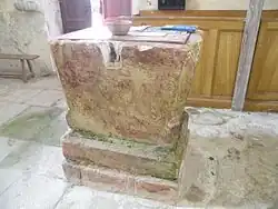 - Les fonts baptismaux appartiennent à un type rare, mais leur intérêt artistique est néanmoins limité. Sur un socle à double ressaut chanfreiné, dont les caractéristiques n'aident pas à la datation, repose une cuve monolithique de plan barlong. Ses faces sont des rectangles inclinés, de sorte que la longueur et la largeur augmentent en approchant du sommet. À la bordure, qui n'est pas décorée, les dimensions sont de 84 cm sur 68 cm. Les arêtes sont coupées en biseau, avec un ressaut près du socle. Cette cuve de facture rustique peut être datée d'une époque comprise entre le XIVe et le XVIe siècle[11],[12].