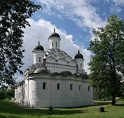 L'architecture de l'époque de Boris Godounov produit des édifices aux proportions élégantes, décorés avec raffinement. De l'ensemble se dégage une grande solennité[2]. La partie principale de l'édifice est un dôme couronné de plusieurs niveaux de somptueux kokochniks. La combinaison de leurs rangées sur la partie centrale et sur les chapelles produit un effet très décoratif. Sur les côtés, sont adjointes deux chapelles symétriques décorées de même. Les murs et les absides sont garnis de fines lésènes et de corniches au profilage complexe. Ces corniches et les plats en faïence de Rhodes inclus au centre des tympans des kokochniks sont d'une grande originalité[3]. Les fenêtres, qui étaient étroites à l'origine, ont été agrandies au XVIIe siècle en même temps que le paperte ouvert était transformé en une galerie circulaire. Au milieu du XVIIIe siècle (1764—1768), le clocher qui était vétuste, a été enlevé et remplacé par un nouveau qui est séparé des autres bâtiments et subsiste encore aujourd'hui. Cette transformation du clocher est due à Andreïan Afanasev et a fort modifié la perspective de l'ensemble : il l'a agrandi et rendu en même temps plus modeste quant aux décors. Un peu moins de cent ans plus tard, en 1845, la partie ouest a été enlevée et un nouveau réfectoire l'a remplacé qui est relié à l'église et au clocher. Selon certains renseignements, dès cette époque, les kokochniks ont été cachés par un simple toit en fer à quatre pans. Cela appauvrit considérablement l'esthétique de l'église.