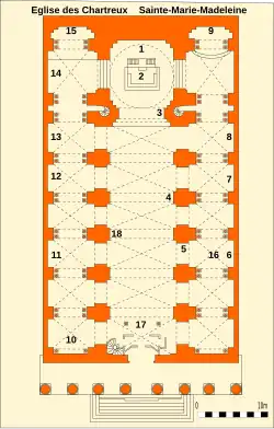 Légende du plan: 1- La Madeleine enlevée par les anges, tableau de Michel Serre, 2- Maître-autel, 3- Christ en croix, sculpture de Chauvel, 4- Chaire, 5- Tombeau de Dom Joseph Martinet, 6- Statue de sainte Thérèse de l'Enfant Jésus par Alfred Lang 7- Statue de saint Antoine de Padoue par Louis Botinelly, 8- Statue de saint Bruno par Louis Botinelly, 9- Statue de sainte Marie Madeleine par Louis Botinelly, 10- Fonts baptismaux, 11- Statue de la Vierge à l'Enfant dite Notre-Dame du Rosaire, 12- Statue de saint Joseph et l'Enfant Jésus par Alfred Lang, 13- Pietà sculpture d'Elie Jean Vézien, 14- Bas-relief de l'Annonciation par Barat, 15- Statue de Notre-Dame de Lourdes par Elie Jean Vézien, 16- Vitraux,- 17- Grand-Orgue Mutin,- 18- Appliques lumineuses.