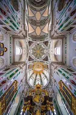 L'intérieur est décoré de pilastres de marbre de style baroque tardif, avec des éléments annonçant le classicisme. Le célèbre Egid Quirin Asam était l'auteur des fresques représentant la vie de saint Ignace de Loyola, aujourd'hui disparues, tandis que la nef avec ses 400 mètres2 était décorée de fresques décrivant les missions de saint François-Xavier aux Indes.