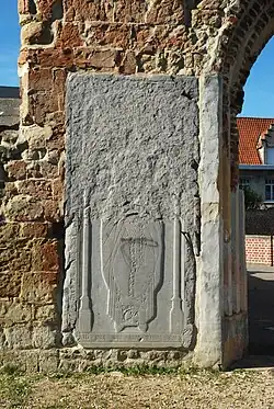 Sur le mur du bas-côté gauche se dressent les dalles funéraires gothiques en pierre bleue de Gheridt Foet († 1481) et Reynder Caus († 1562)[9].