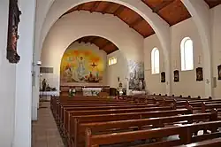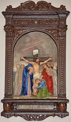 Les quatorze stations du Chemin de Croix se trouvent réparties de chaque côté de la nef. Elles sont réalisées en tôles embouties et peintes, imitant le bois.
