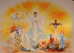« Le Jeudi saint, assorti de l'institution de l'Eucharistie, je l'ai illustré par les épis de blé et les ceps de vignes. Quant au Vendredi saint, pour commémorer la Passion, j'ai peint un Calvaire très dépouillé où Marie est en compassion avec Jean. Du Samedi saint, j'ai retenu l'eau, symbole du baptême et le feu nouveau victorieux des ténèbres. Pâques m'a inspiré un Ressuscité rayonnant dans une mandorle de gloire, triomphant du mal et de la mort. » témoignera Francis Michelet dans l'ouvrage de Jean-Claude et Lydie Michelet-Mariéthoz (cf. Références). À la question de la signification de la présence du rocher sur la fresque, il répond : « Mon idée? Il existe à Fey un Club de montagne. Ce rocher, je l'ai voulu comme un clin d'œil en direction de cette jeunesse [...] ».
