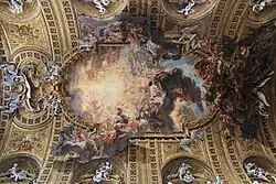 Le plafond peint est exécuté en trompe-l'œil, il laisse déborder de faux nuages et certaines figures hors du cadre, sur les motifs réguliers du plafond peint. Une zone marquée par le monogramme du Christ, IHS (Iesus Hominum Salvator, « Jésus sauveur des hommes »), indique le point de vue que le spectateur doit adopter pour que l'illusion soit totale. Les jésuites trouvent en il Bacciccio l'interprète de la doctrine promulguée par le Concile de Trente[pas clair][2]. Ce plafond est l'un exemple type de la peinture baroque en trompe-l'œil et le summum de l’idéal baroque[5].