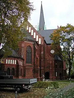 Les plans sont confiés aux architectes Conrad Wilhelm Hase et Max Spitta qui bâtissent pour 230 000 marks[2] une église néogothique en briques dans le style du nord de l'Allemagne. Elle est consacrée le . C'est la première église à être prête d'un programme de constructions de cinquante-deux églises dans tout le pays. L'empereur et son épouse viennent plusieurs fois s'y recueillir et l'on montre encore les deux sièges qui leur étaient réservés. La maison paroissiale est construite dans le même style l'année suivante, par Max Spitta. Elle abrite une soupe populaire, un centre de soins et une crèche (reconstruite en 1992).