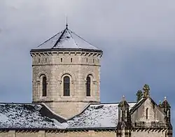 Une tour-lanterne octogonale s'élève au-dessus de la croisée du transept. Cette église reprend le style néo-roman, très en vogue au XIXe siècle. Le décor se compose essentiellement de mosaïque et de sculpture.
