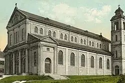 L'église sans transept de style néoclassique est bâtie selon le plan d'une basilique romaine, précisément sur le modèle de la basilique Saint-Paul-hors-les-Murs. Le narthex est pavé de mosaïque et la colonnade de la façade d'ordre corinthien, ainsi que les voûtes en berceaux et les plafonds à caissons rappellent l'architecture de la première époque baroque de la fin de la Renaissance italienne.