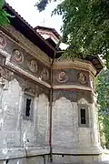 C’est un exemple du style brâncovan : décor en médaillons représentant des saints, arabesques florales peintes sur les murs et dentelle de pierre autour des Verrières.
