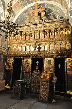 À l’intérieur, l’église abrite des icônes et les murs sont entièrement peints et revêtus de dorures.