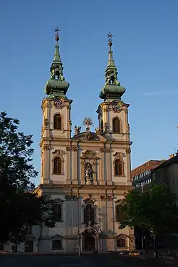 L'architecte qui dessina les premiers plans pour les jésuites reste inconnu mais la construction débuta en 1740 sous la direction de Hamon Kristóf ; Mátyás Nepauer poursuivit les travaux après sa mort. Un tremblement de terre en 1763 et, dix ans plus tard, la dissolution de la Compagnie de Jésus en Autriche-Hongrie retardèrent l'achèvement du sanctuaire qui ne fut consacré qu'en 1805. Le café Angelika occupe aujourd'hui l'ancien presbytère.