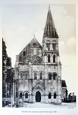 Au dernier quart du XIXe siècle, l'architecte Paul Selmersheim retrouve l'absidiole nord de l'église primitive au droit de la huitième travée de l'église actuelle. Des vestiges de la fin du XIe siècle ou du début du XIIe siècle subsistant toujours à l'extrémité septentrionale de la nef au revers du massif occidental (située en fait au nord-nord-ouest), dont des colonnettes à chapiteaux et une porte bouchée[16], Eugène Lefèvre-Pontalis a conclu à une église romane assez vaste, et fort de sa connaissance de l'architecture religieuse régionale de cette époque, et en tenant compte des constatations de Selmersheim[17], en propose une reconstitution[18]. Or, des fouilles plus poussées sont menées en 1955 par Pierre Durvin à l'intérieur de l'église[19], à l'occasion de son redallage. Son rapport ne dépasse malheureusement pas cinq pages et la documentation de ces fouilles reste donc insuffisante, mais il remet au jour une grande partie des fondations de l'église primitive, qui s'avère nettement plus petite que celle supposée par Lefèvre-Pontalis. Elle n'atteint notamment pas le massif occidental. Longue de 26,00 m, large de 11,50 m, elle présente une nef unique se terminant par une abside centrale et deux absidioles. Le chevet suggère un plan basilical, mais les piliers d'éventuelles grandes arcades n'ont pas été mis en exergue. L'interprétation des vestiges toujours visibles à l'extrémité occidentale de la nef pose dès lors problème. Philippe Racinet émet l'hypothèse que les moines y auraient déposé des restes de la première église pour lui rendre hommage, ce qui paraît peu vraisemblable du fait que le petit portail a dû être bouché dès l'édification du massif occidental. Plus probablement, un premier projet de construction d'une nouvelle église a dû être lancé dès la fin du XIe siècle ou du début du XIIe siècle, interrompu dès l'achèvement de la façade[20],[21].
