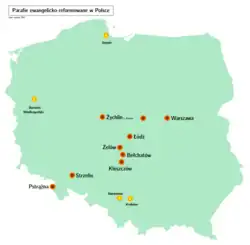 - ↑ The Lesser Polish Reformed Protestants were organised in four congregations. Cf. Małgorzata Kośka: "Akta Gmin Kościoła Ewangelickiego Augsburskiego i Helweckiego Wyznania 1786 — 1939" « https://web.archive.org/web/20110817004429/http://www.agad.archiwa.gov.pl/pomoce/AKEAH427.xml »(Archive.org • Wikiwix • Archive.is • Google • Que faire ?), , Archiwum Główne Akt Dawnych w Warszawie (AGAD; Central Archives of Historical Records in Warsaw) « https://web.archive.org/web/20120417201916/http://www.agad.archiwa.gov.pl/ »(Archive.org • Wikiwix • Archive.is • Google • Que faire ?), ; retrieved on 6 May 2012.