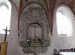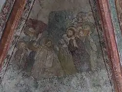 Dans le chœur de l'église simultanée, dédiée à Notre-Dame, on peut admirer des fresques peintes au XVe siècle, illustrant les mystères du christianisme, tel que le couronnement de la Vierge, le Jugement dernier. D'autre part, des dalles funéraires sont apposées contre les murs du sanctuaire.