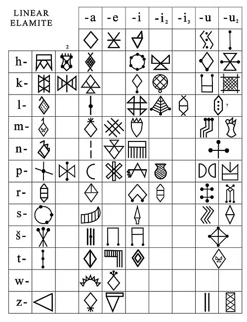 Au cours du temps, trois graphies élamites se sont succédé. L'élamite cunéiforme est déchiffré, et le linéaire l'est depuis 2017[5]. Le proto-élamite reste non déchiffré.
