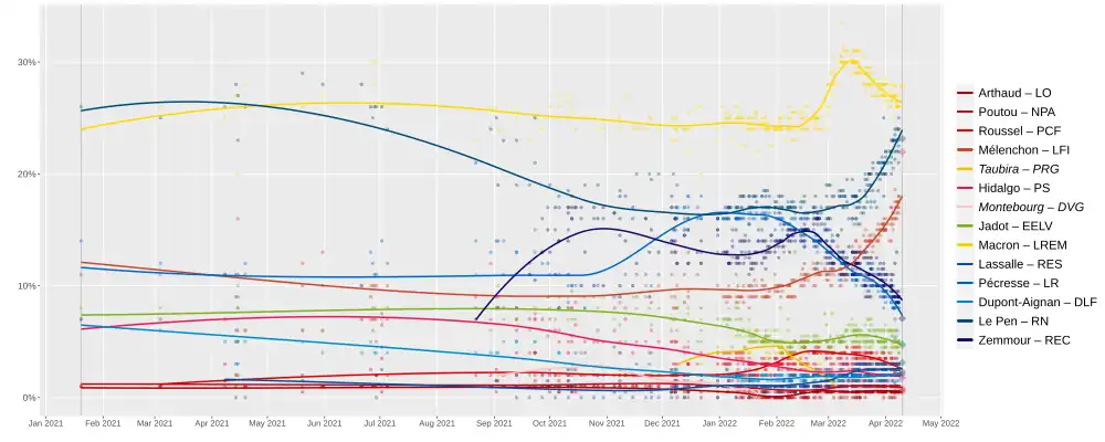 - ↑ « Sondage: Macron en baisse, Le Pen et Mélenchon en hausse, Zemmour chute », sur France 24, (consulté le ).