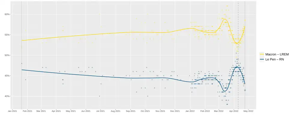 Arrivé en tête du premier tour, le président sortant Emmanuel Macron (27,85 %[a]) affronte Marine Le Pen (23,15 %), un duel identique à celui du scrutin de 2017. C'est la deuxième fois qu'un second tour opposant les mêmes candidats à deux scrutins présidentiels consécutifs a lieu après ceux où se sont affrontés Valéry Giscard d'Estaing et François Mitterrand en 1974 et 1981.