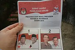 L'élection présidentielle indonésienne de 2014 s'est tenue le afin d'élire le président et le vice-président pour un mandat de 5 ans. Il s'agit de la troisième élection présidentielle au suffrage direct. Le résultat en a été officiellement proclamé le par la commission électorale indonésienne (KPU), avec comme vainqueur Joko Widodo, qui a obtenu 53,15 % des voix contre Prabowo Subianto, qui en a obtenu 46,85 %[1]. Joko Widodo sera officiellement investi le .