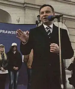 Longtemps pressenti pour se présenter à l'élection présidentielle, l'ancien président du Conseil Jarosław Kaczyński, chef du parti Droit et justice (PiS) et frère jumeau de l'ancien président Lech Kaczyński, avait fait acte de candidature en 2012[9] avant de renoncer pour appuyer celle de l'un de ses fidèles, Andrzej Duda. Celui-ci, député européen, est formellement désigné par son parti durant une réunion publique, le .