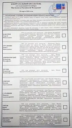 De nombreux commentateurs politiques, dont l'ancienne candidate à l'élection présidentielle Irina Khakamada, évoquent la difficulté de rassembler des signatures sans le soutien d'un parti politique[29]. Cependant, selon la présidente de la CEC Ella Pamfilova, les conditions d'accès aux candidats sont plus faciles que jamais car ils n'ont plus besoin de collecter 1 000 000 de signatures. Par conséquent, selon Pamfilova, il pourrait y avoir encore plus de candidats à cette élection qu'en 2000, lorsque onze candidats s'étaient présentés[30]. En fin de compte, huit candidats concourent en 2018, soit trois de plus que lors de la dernière élection en 2012.