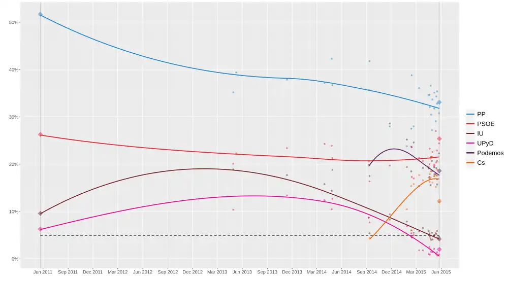 | Institut | Date | PP | PSOE | IU | UPyD | Podemos | C's | Autres | En-tête |