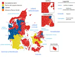 Les 175 sièges pour le Danemark, sont répartis entre 3 régions : Copenhague, le Jutland et les îles. Ces 3 régions sont subdivisées en 3 circonscriptions urbaines et 7 circonscriptions rurales. Le nombre de sièges alloués à chacune de ces circonscriptions, est proportionnel au nombre de ses habitants, est revu tous les cinq ans. 135 de ces sièges sont réservés au scrutin de circonscription, répartis avec la méthode de Hondt, les 40 autres étant compensatoires et répartis entre les différentes formations politiques faisant leur entrée au parlement dans le but de leur assurer une représentativité aussi exacte que possible. Pour accéder à la répartition des sièges compensatoires, une formation doit avoir obtenu un minimum de sièges dans une circonscription donnée ou bien un nombre de suffrages supérieur ou égal au nombre de voix nécessaires à l'obtention d'un siège dans au moins 2 des 3 régions du royaume, ou encore au moins 2% des suffrages exprimés au niveau national. Les sièges compensatoires sont attribués entre les régions et circonscriptions avec la méthode de Sainte-Laguë[7]. Les électeurs disposent en outre d'un vote préférentiel, leur permettant d'exprimer leur préférence pour un candidat au sein de la liste pour laquelle ils votent : la répartition des sièges au sein des listes s'opère donc en fonction des votes préférentiels, les candidats élus étant ceux ayant rassemblé le plus de votes préférentiels sur leur nom[7].