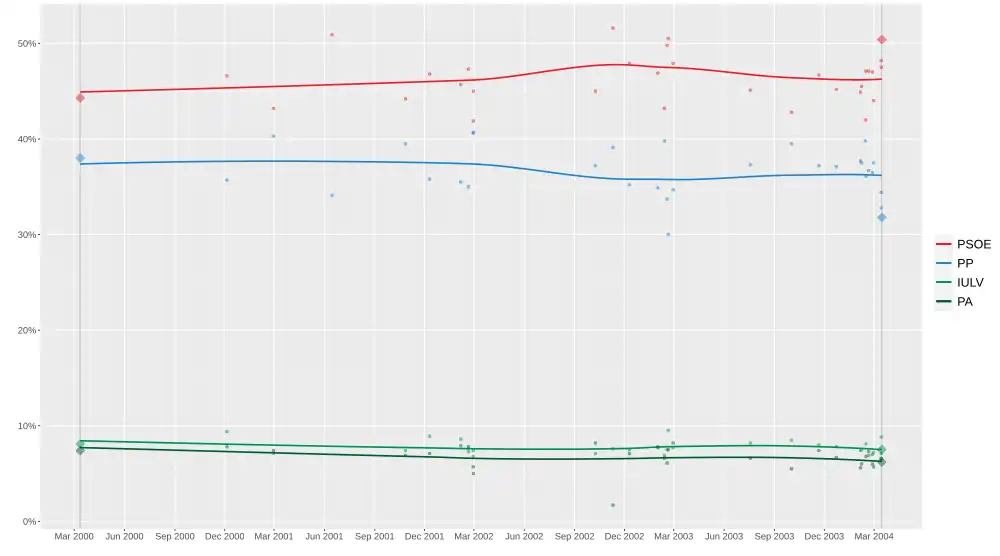 Le Parti socialiste (PSOE-A) du président de la Junte Manuel Chaves remporte les élections régionales du 12 mars 2000 avec une majorité relative de 52 députés sur 109. Il devance le Parti populaire (PP) de la maire de Cadix Teófila Martínez, qui réalise son meilleur résultat dans la communauté autonome avec 46 sièges. Si le Partido Andalucista (PA), partenaire de coalition du PSOE-A, obtient un résultat stable, la Gauche unie Les Verts – Appel pour l'Andalousie (IULV-CA) est en net recul, perdant sept députés sur treize. Une répétition de l'alliance entre socialistes et nationalistes andalous est alors attendue[1].