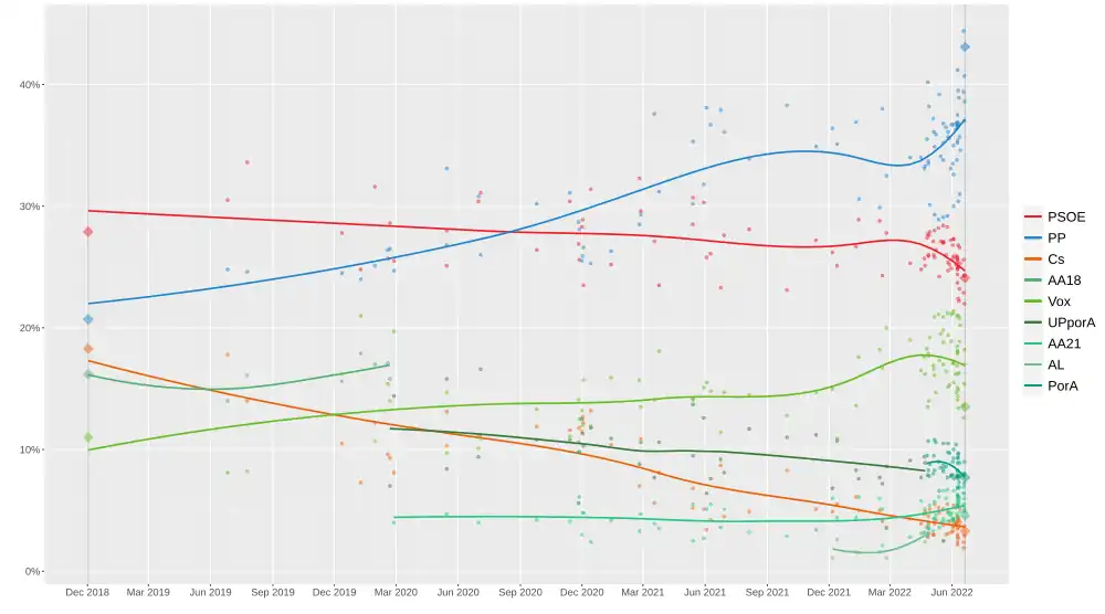 | Institut | Date | PSOE | PP | Cs | UPxA | Vox | AA | AL | PorA |