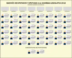 L'Assemblée législative est le parlement monocaméral du Salvador, il est composé de 84 députés élus pour trois ans au scrutin proportionnel plurinominal à listes ouvertes et au plus fort reste. Les sièges sont à pourvoir dans 14 circonscriptions plurinominales de 3 à 24 sièges correspondants aux départements du Salvador selon leur population[2],[3].