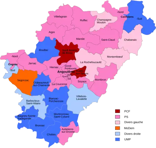 - ↑ Résultats des élections cantonales de 2011 dans le canton de Cognac-Nord