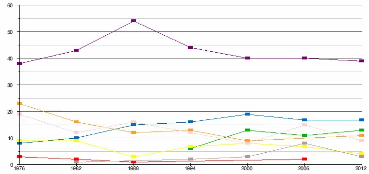 Évolution du pourcentage des voix recueillies par les partis ou alliances politiques par rapport au nombre de bulletins déposés aux élections communales depuis 1976.