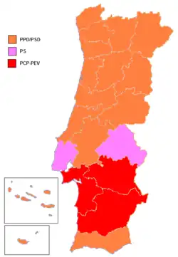 NB : en 2004 le Parti social-démocrate et le Parti populaire avaient fait liste commune sous la bannière "Força Portugal" et avaient obtenu 33,3 % des suffrages exprimés. Les scores cumulés des listes présentées par ces deux formations en 2009 représentent un total de 40,1 % des suffrages exprimés, soit une progression globale de l'ordre de 6,8 points par rapport au scrutin précédent.