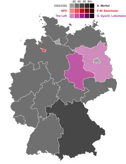 Rejeté dans l'opposition, le Parti social-démocrate (SPD) doit faire face à une chute vertigineuse de plus de onze points et obtient, avec 23 % des voix, son plus mauvais résultat depuis l'instauration de la République fédérale. « C'est un jour amer pour la social-démocratie allemande, il n'y a aucun moyen de présenter favorablement ce résultat » a déclaré Frank-Walter Steinmeier à la suite de la publication des résultats préliminaires[24]. Laminé par la CDU dans le cadre du scrutin uninominal, avec seulement 64 mandats directs[25], le SPD a perdu plus de dix millions d'électeurs depuis les élections de 1998, qui avaient vu la victoire triomphale de Gerhard Schröder. Cette lourde défaite contraste avec la progression des Verts, qui, en franchissant la barre des 10 %, obtiennent le meilleur résultat de leur histoire à ce type d'élection. Record battu également du côté de Die Linke, qui réalise la meilleure performance du scrutin après le FDP[26]. Avec près de 12 % des suffrages exprimés, le parti de gauche emporte en outre seize mandats directs dans plusieurs länder de l'est du pays, battant de ce fait un autre record, aucun parti n'ayant encore jamais réussi à obtenir autant d'élus au scrutin majoritaire en dehors de la CDU, de la CSU et du SPD.