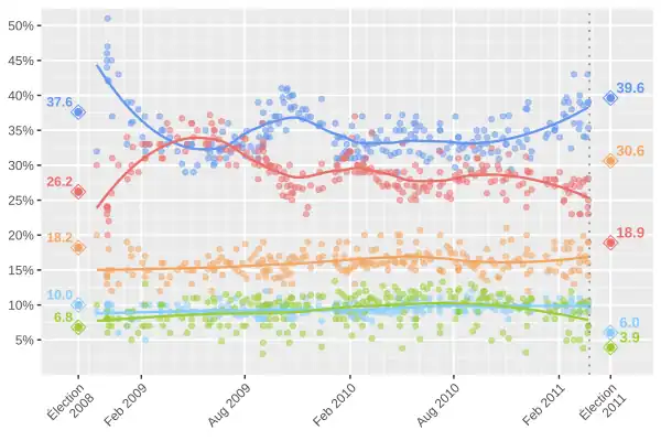 Au cours de la 40e législature, l'appui de l'opinion publique pour le Parti conservateur fluctue entre 30 % et 40 %. Un sondage montre que les conservateurs atteignent plus de 50 % après que le Parti libéral et le NPD ont proposé une coalition. Au Canada, un pourcentage de 40 % des votes est habituellement considéré suffisant pour former un gouvernement majoritaire. Pendant ce temps, l'appui de l'opinion publique pour le Parti libéral varie entre 25 % et 35 %, le NPD demeure entre 15 % et 20 %, et le Bloc et le Parti vert autour de 10 %.