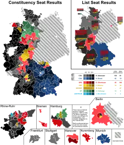 Lors des élections fédérales du , la nouvelle alliance chrétienne-démocrate CDU/CSU, emmenée par le président du Conseil parlementaire Konrad Adenauer, devient la première force politique de la nouvelle République fédérale. Avec 31 % des voix et 139 parlementaires sur 402, elle devance le Parti social-démocrate d'Allemagne (SPD), vieux de 74 ans, pilier de la république de Weimar et qui réunit 29,2 % des suffrages exprimés et 131 députés.