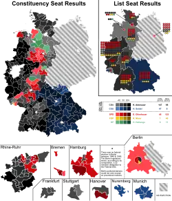 | Parti social-démocrate d'Allemagne (SPD) | 9 651 669 | 32,01 | 46 | 9 495 571 | 31,75 | 123 | 169 | 12 | 181 | |||||