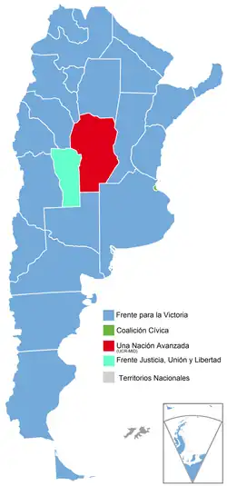La formule Cristina Kirchner-Julio Cobos a obtenu 45,29 % des suffrages au premier tour, devant la formule centriste Elisa Carrió (Coalition civique)-Rubén Giustiniani (Parti socialiste), qui obtint 23,04 % des voix, pas suffisamment pour mettre en ballottage Kirchner.