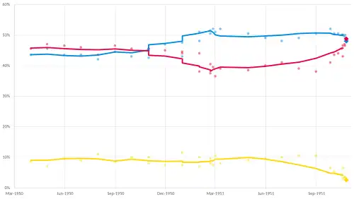 Par rapport aux élections générales de 1950 la progression en voix est forte pour le Parti conservateur qui passe de 11 507 061 à 12 659 712 voix, modérée pour les travaillistes qui obtiennent 13 948 883 voix contre 13 266 592 en 1950 alors que le Parti libéral est en très fort recul avec 730 546 voix contre 2 621 487 en 1950.