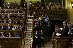 Le , le secrétaire général du PSOE Pedro Sánchez est poussé à la démission par les cadres dirigeants du parti après avoir tenté de convoquer un congrès et s'être opposé à une abstention permettant à Rajoy d'être de nouveau investi[6]. Trois semaines plus tard, la direction du parti approuve la proposition soutenue par la direction provisoire d'une abstention des députés socialistes afin de permettre le maintien du président sortant au pouvoir et d'éviter de nouvelles élections[7]. Lors d'un nouveau vote d'investiture le , Mariano Rajoy est réélu à la présidence du gouvernement par 170 voix pour, 111 contre et 68 abstentions, même si 15 parlementaires socialistes rompent la discipline de vote et s'opposent à cette investiture[8].