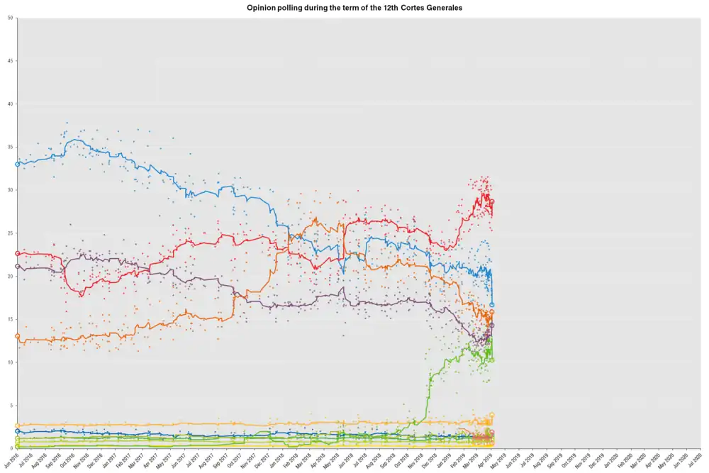 Pedro Sánchez annonce le , à la suite d'un conseil des ministres extraordinaire, son intention de demander au roi la dissolution des deux chambres des Cortes Generales et la convocation d'élections anticipées pour le suivant[34]. C'est alors la première fois depuis que les élections parlementaires se tiennent à peine un mois avant les élections municipales. La campagne et le scrutin se tiennent par ailleurs en plein procès des anciens dirigeants indépendantistes catalans, jugés pour leur rôle dans l'organisation du référendum d'indépendance du [35]. Il s'agit de la huitième dissolution anticipée des Cortes depuis l'entrée en vigueur de la Constitution en [36].
