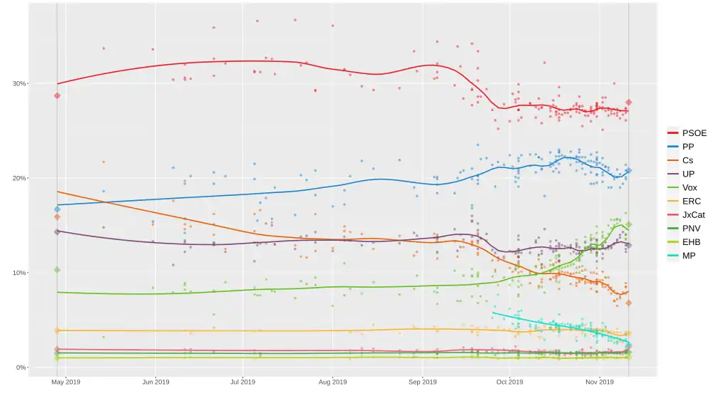 Le graphique ci-dessous est une synthèse des résultats des sondages réalisés depuis les élections du 28 avril 2019. La largeur du graphique correspond à la durée du mandat de quatre ans qu'aurait dû connaitre la législature issue de ces élections. La publication de sondages électoraux est interdite en Espagne à partir du jusqu'au scrutin.