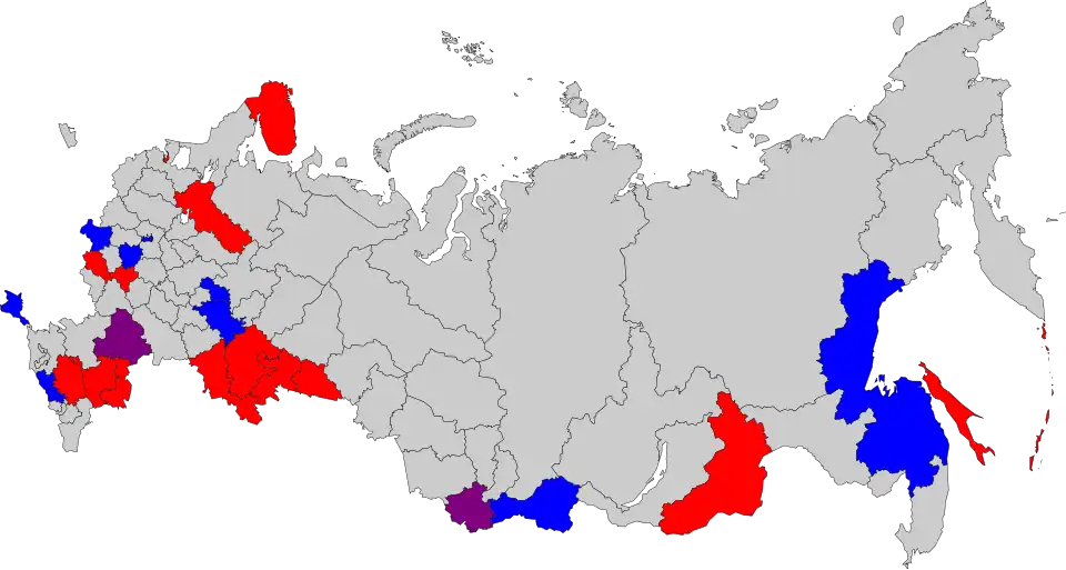 Les trois villes russes d'importance fédérale disposent d'un territoire étendu en dehors des limites urbaines. Les citoyens participent à des élections législatives ainsi qu'à des municipales distinctes. Des élections municipales sont organisées dans 21 autres sujets, dont à Tcheliabinsk où elles ont lieu au scrutin indirect.