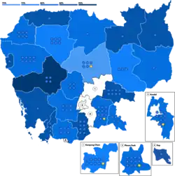 L'Assemblée nationale est la chambre basse du parlement bicaméral du Cambodge. Elle est composée de 125 sièges dont les membres sont élus pour cinq ans au scrutin proportionnel de liste dans vingt cinq circonscriptions de 1 à 12 sièges correspondants aux provinces cambodgiennes plus la capitale Phnom Penh[14]. Le scrutin se tient avec des listes fermées et les résultats en voix conduisent à une répartition des sièges sur la base du quotient de Hare et selon la méthode à la plus forte moyenne[15].