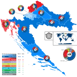 Le Parlement de Croatie — en croate Hrvatski sabor, souvent abrégé en Sabor — est un parlement unicaméral doté de 151 sièges pourvus pour quatre ans au scrutin proportionnel plurinominal avec listes semi-bloquées et seuil électoral de 5 % dans douze circonscriptions électorales. Dix d'entre elles — dotées de quatorze sièges chacune — sont basées sur les limites des vingt comitats du pays et de la capitale Zagreb, ajustées de manière à obtenir une répartition relativement uniforme des électeurs croates, une marge de plus ou moins 5 % étant tolérée d'une circonscription à l'autre. Trois autres sièges sont réservés à la diaspora croate, le reste du monde formant une onzième circonscription. Les huit sièges restants sont quant à eux réservés aux vingt-deux minorités ethniques nationales reconnues par le gouvernement croate et sont à pourvoir au scrutin majoritaire dans une douzième circonscription qui se superpose aux dix premières et recouvre l'ensemble du pays. Trois sièges sont ainsi réservés aux Serbes, un aux Italiens, un aux Hongrois, un aux Tchèques et Slovaques, un aux Albanais, Bosniaques, Macédoniens, Monténégrins et Slovènes et enfin un aux Autrichiens, Bulgares, Allemands, Juifs, Polonais, Roms, Roumains, Ruthènes, Russes, Turcs, Ukrainiens et Valaques. Dans chacun de ces groupes, le ou les candidats ayant réuni le plus de voix sont élus[13].