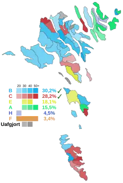 Dans le seul Danemark, le Bloc de gauche manque la majorité absolue d'un seul siège (87 sur 175), mais il obtient tout juste cette majorité absolue (90 sur 179) avec les députés élus dans les autres pays constitutifs. En effet, trois des partis féroïens et groenlandais ayant remporté des sièges au Folketing sont des soutiens du Bloc rouge : le Parti social-démocrate féroïen, et les partis Inuit Ataqatigiit et Siumut du Groenland.