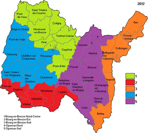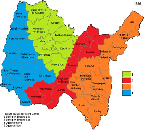 La création de la 5e circonscription entraîne des modifications dans toutes les autres. Cette création est basée sur les cantons de Brénod , Champagne-en-Valromey , Hauteville-Lompnes , Lhuis , Saint-Rambert-en-Bugey et Virieu-le-Grand , provenant de la 3e circonscription , ainsi que ceux d'Ambérieu-en-Bugey , Izernore , Nantua , Oyonnax Nord , Oyonnax Sud et Poncin , de la 2e circonscription , laquelle prend les cantons de Miribel , Reyrieux et Trévoux à la 4e , qui échange le canton de Bourg-en-Bresse-Sud et le canton de Péronnas avec la 1re contre le canton de Pont-de-Vaux .